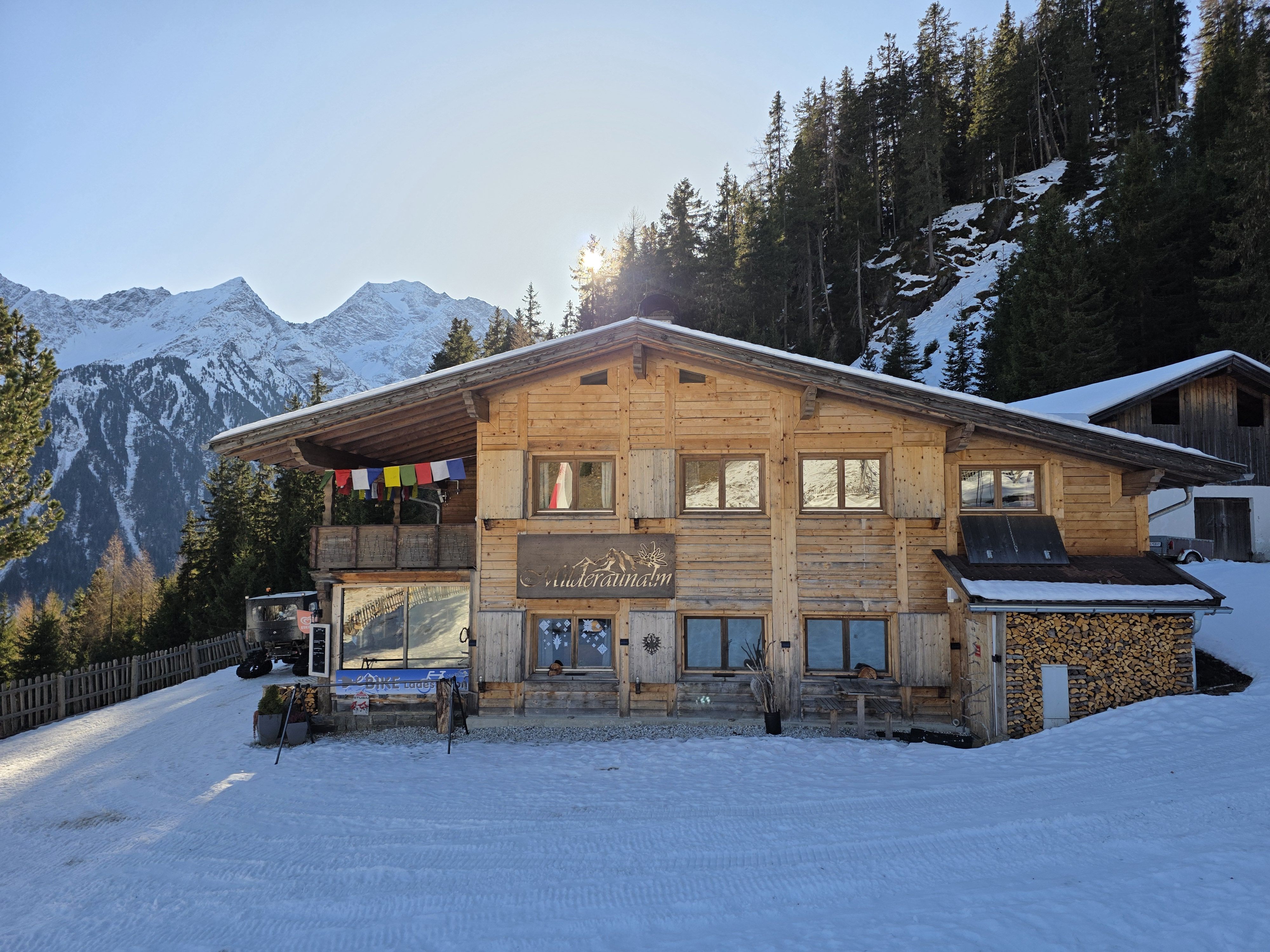 Am Ziel angekommen, wartet die sonnig gelegene Milderaunalm auf rund 1.675 m Seehöhe. Von hier eröffnen sich schöne Ausblicke auf den Serles- und Habichtkamm. Die Alm ist ganzjährig ein beliebtes Ziel – im Winter besonders bei Rodlern und Winterwanderern, im Sommer auch bei Mountain- und E-Bikern sowie als Ausgangspunkt für weitere Touren.